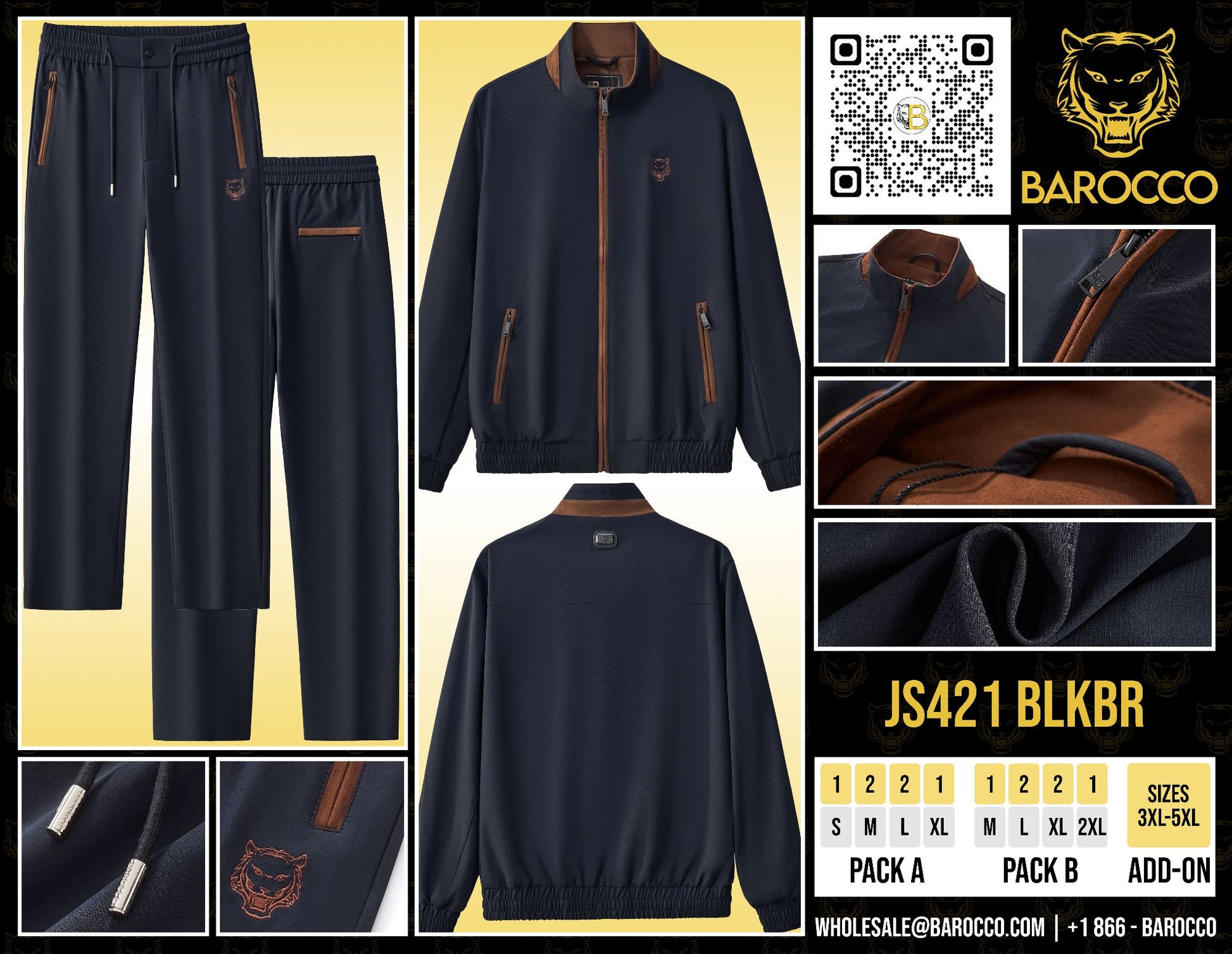 The Apex Trim Performance Set blends athletic functionality with refined Barocco detailing. Crafted from a smooth nylon-stretch blend, the jacket and pant deliver a lightweight, flexible feel ideal for elevated everyday wear. Contrast trim accents and the subtle embroidered crest add a polished finish, giving the set a distinguished yet modern street-luxury identity.