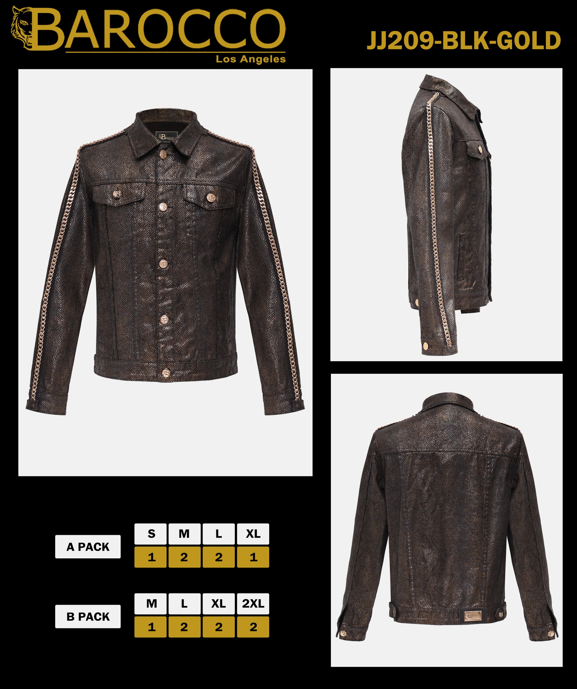 “Make a statement on the runway and red carpet with the JJ208 Embellish Edge Jacket. This standout piece is crafted from a luxurious snakeskin fabric that effortlessly combines style and sophistication. Adorned with striking gold Cuban link chains along the sleeves, this jacket embodies the essence of bling, perfect for singers and artists who command attention. Designed with stretch for maximum comfort, the Embellish Edge Jacket allows for freedom of movement while maintaining a tailored fit.”