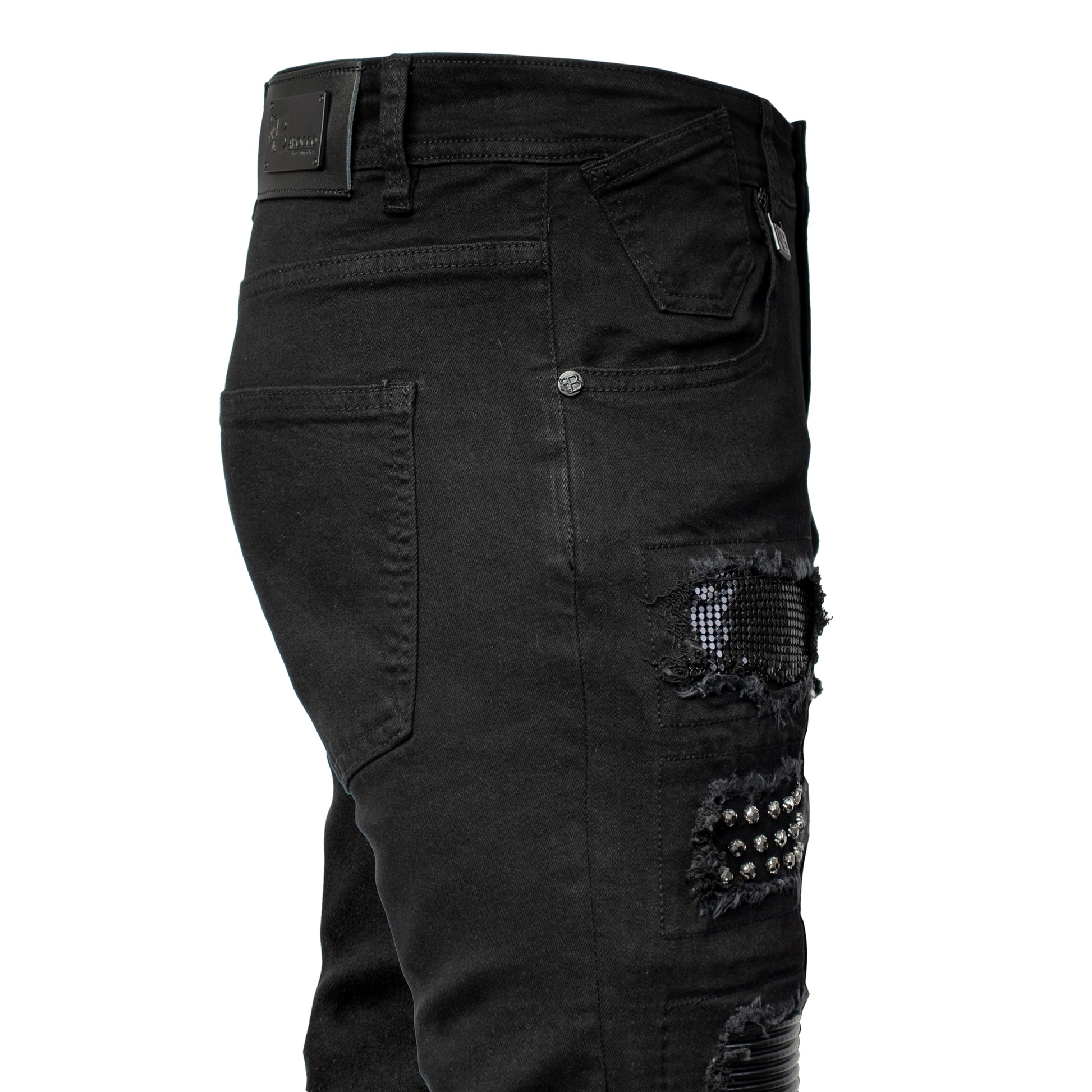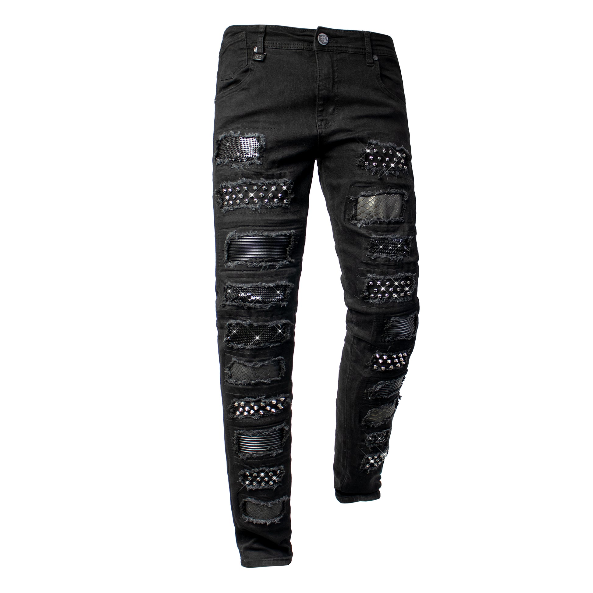 Step into the spotlight with the CITY DAZE denim pants, where edgy streetwear meets high fashion. Designed for the modern man who isn’t afraid to make a statement, these skinny-fit jeans boast a perfect blend of comfort and elegance, ensuring you feel as good as you look. Crafted from premium stretch denim, these pants move with you, providing ultimate comfort while maintaining a sleek silhouette. The distressed detailing adds a rugged charm, while the rhinestone backing elevates the look with a touch of bling, perfect for standout occasions. The moto backing further enhances the edgy aesthetic, making these pants suitable for both casual outings and red carpet events. Whether you're a singer or an artist looking to shine on stage or a fashion-forward individual attending a runway show, these embellished jeans will effortlessly take your ensemble to the next level. Pair them with a sharp blazer for a dressy casual look, or style them with your favorite tee for a laid-back vibe. Embrace the versatility of the CITY DAZE denim pants—where sophisticated streetwear meets undeniable glamour. Perfect for those who appreciate fashion that transcends the ordinary, these pants are your go-to choice for any occasion.