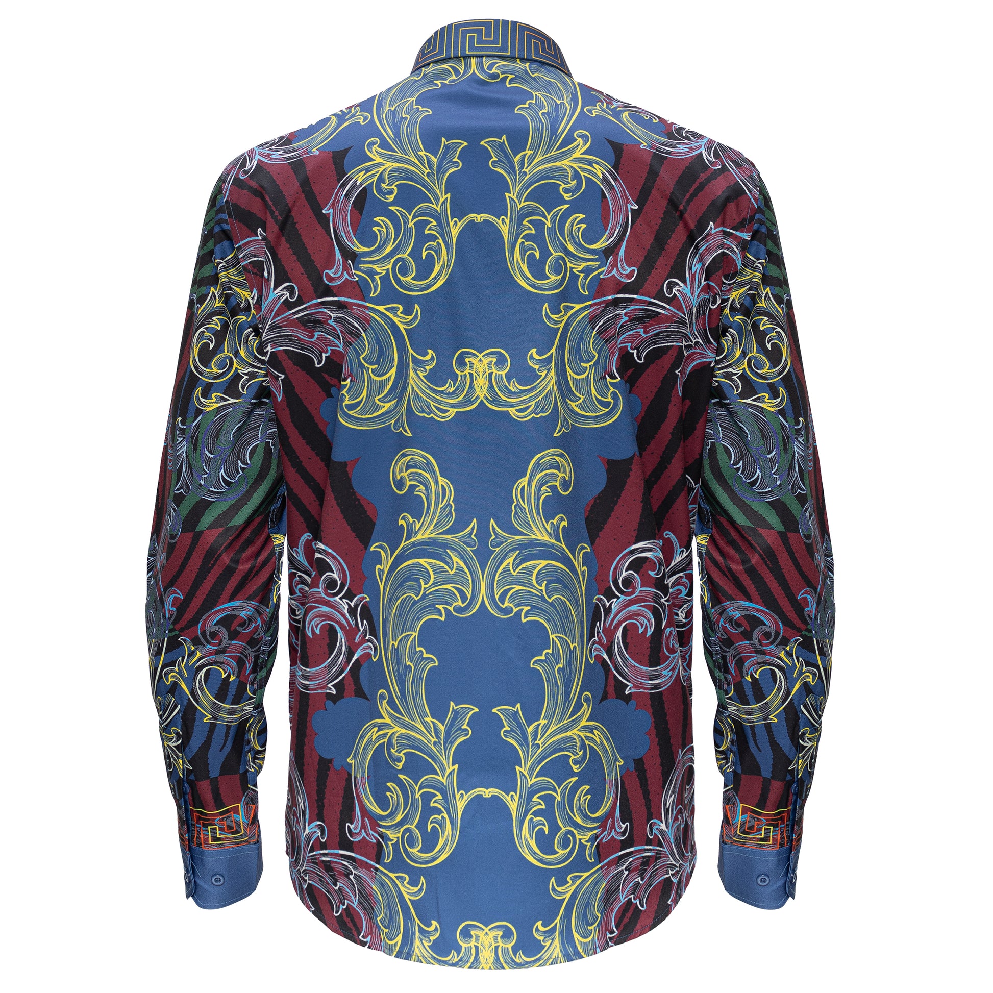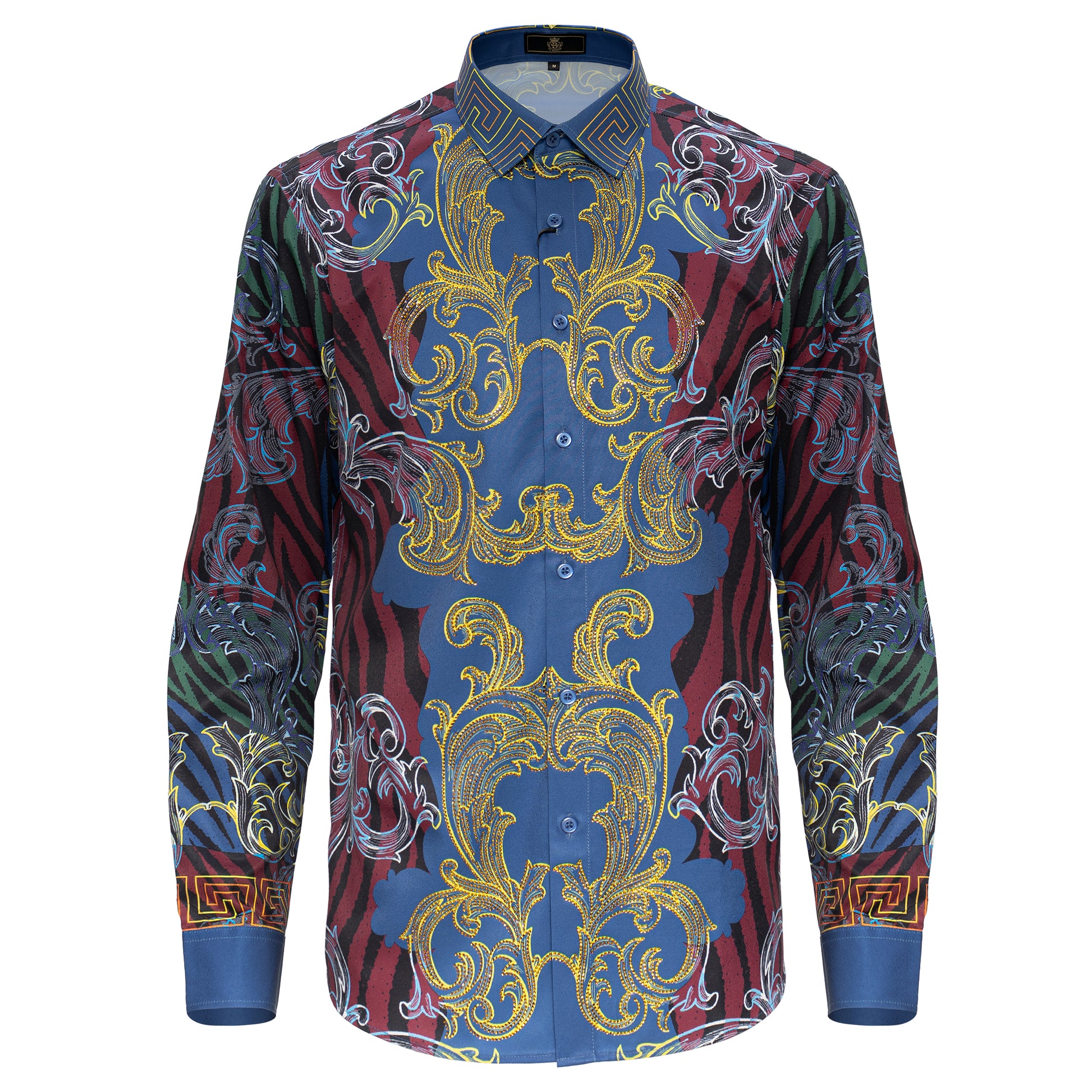 Make a bold statement with the ERS405 'Looking Sharp' Button-Up Shirt by El Baron. Designed for the modern man who values style and comfort, this shirt features a unique blend of stretch and smooth fabric, ensuring a fit that moves with you while maintaining a sleek silhouette. Crafted from breathable fabric, it provides optimal comfort, making it perfect for any occasion. The striking red and black vertical stripes add a touch of sophistication, while the vibrant blue in the placket brings a pop of color that sets you apart. Detailed with intricate Greek key patterns on the sleeves and collar, this shirt offers a distinctive edge. Gold accents elevate the overall design, adding a touch of luxury to your look. Whether you're dressing for a casual outing or a more formal event, the 'Looking Sharp' Button-Up Shirt by El Baron ensures you always look your best. Step into sophistication and redefine your wardrobe with this exceptional piece.