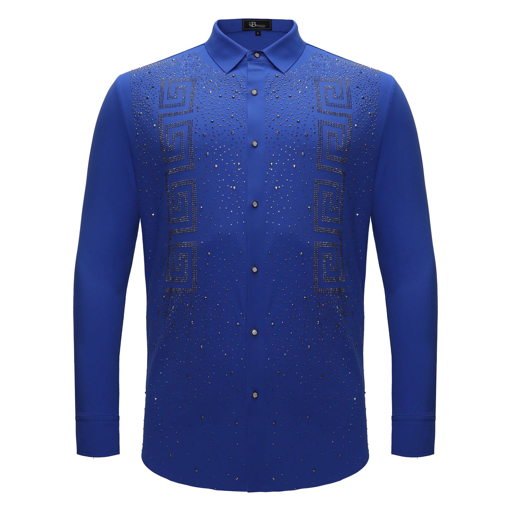 Unleash your confidence with the B553 Button-Up Shirt—a true embodiment of style and sophistication. Crafted with 4-way stretch and breathable fabric, this shirt ensures extra comfort while allowing for unrestricted movement. The innovative stitchless technology offers a sleek finish, eliminating irritation and enhancing wearability. The standout Greek key pattern gracefully adorns the body, creating a striking visual appeal that commands attention. Each key is thoughtfully studded with crystals, adding a touch of refined elegance to your ensemble. Perfect for both professional and social settings, this shirt redefines modern masculinity with its bold design and luxurious feel.