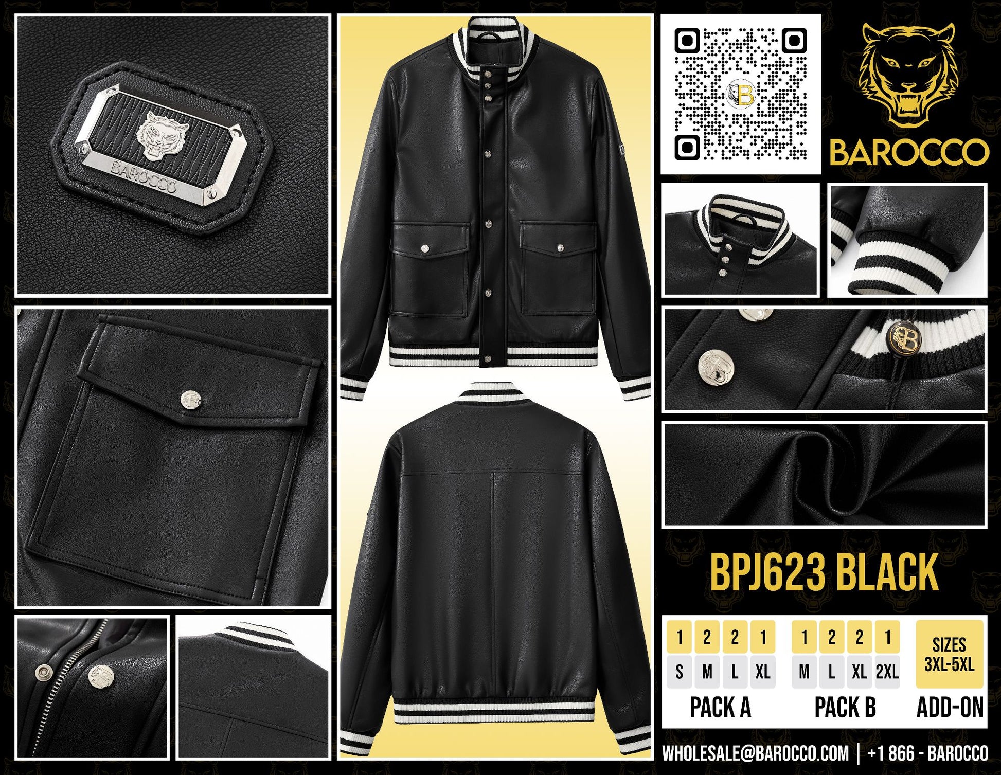 The Prestige Varsity PU Jacket blends iconic varsity attitude with Barocco’s elevated edge. Crafted with a smooth PU exterior and grounded by a cotton backing for comfort, it delivers a structured, premium feel without sacrificing ease of movement. Rib-knit striped cuffs and hem bring classic athletic detailing, while oversized flap pockets and polished snaps create a bold, modern silhouette. A statement outerwear piece built for standout street-lux styling.