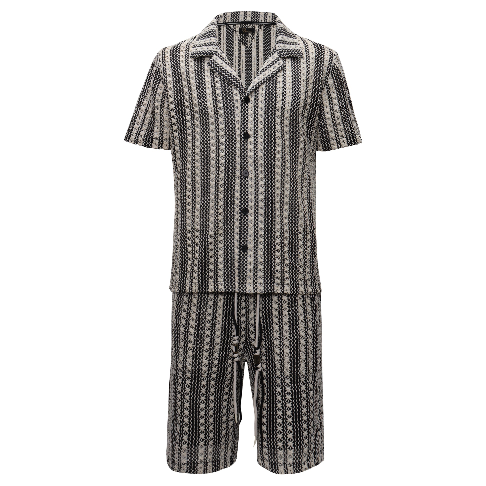 Make a statement with this refined two-piece set, featuring a short-sleeve button-up shirt and matching drawstring shorts. Designed with an intricate textured stripe pattern in neutral tones, this set brings a touch of vintage charm to modern casualwear. The relaxed fit and lightweight fabric ensure maximum comfort, making it perfect for summer outings, vacations, or lounging in style.