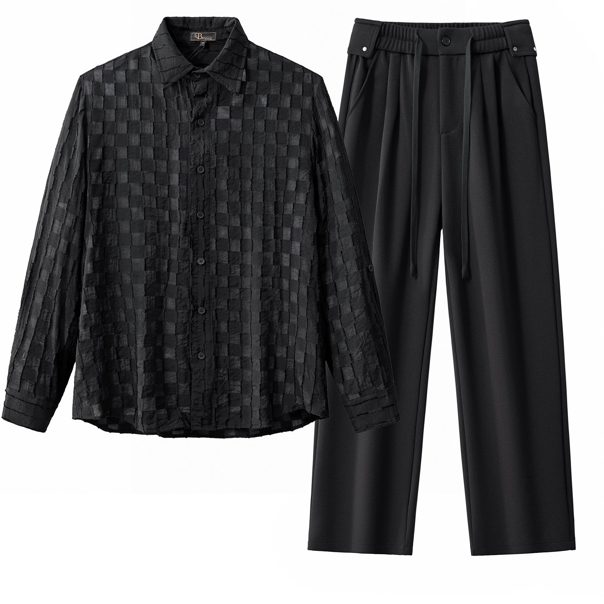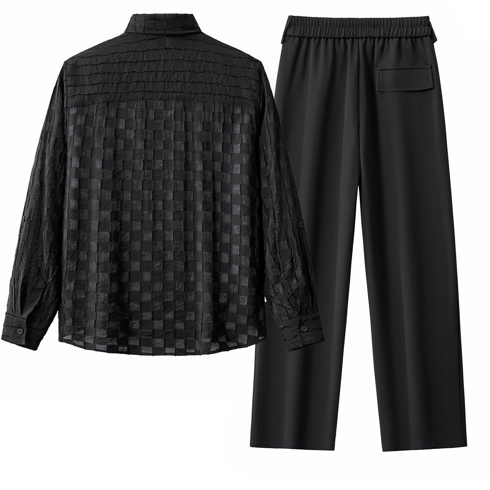 Looking for something that feels put-together without trying too hard? This all-black set brings just the right balance of relaxed style and everyday polish. The Haven Long Sleeve Shirt is made from a breathable textured fabric that adds subtle detail without being loud. It’s lightweight, drapes naturally, and works great on its own or layered under a jacket. The Solace Pleated Trousers finish the look with a wide-leg cut and clean lines, plus a drawstring waistband that keeps things feeling comfortable but still sharp.
