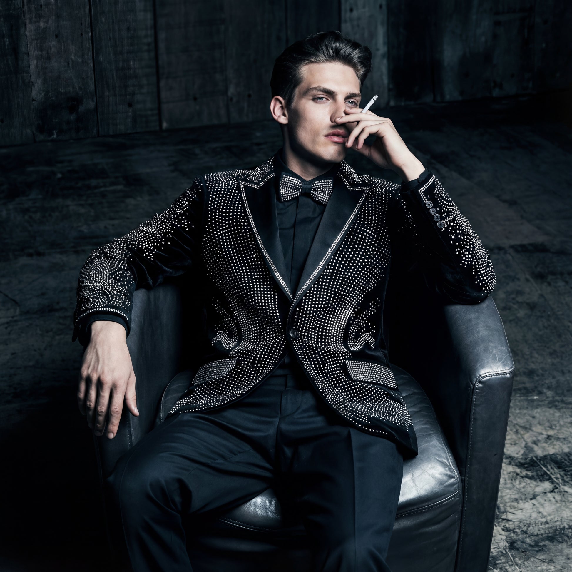 Este blazer encarna el lujo característico de Barocco, fusionando un intrincado trabajo de adornos con una silueta esculpida y sofisticada. Miles de tachuelas, colocadas con precisión, forman amplios patrones en cascada en la parte delantera, las mangas y la espalda, creando una dimensión dramática y una presencia visual imponente. Su suave base de terciopelo y los refinados detalles de la solapa le otorgan un acabado distinguido, ideal para eventos de alta gama, un estilo de noche o cualquier momento que requiera un toque artístico excepcional.
